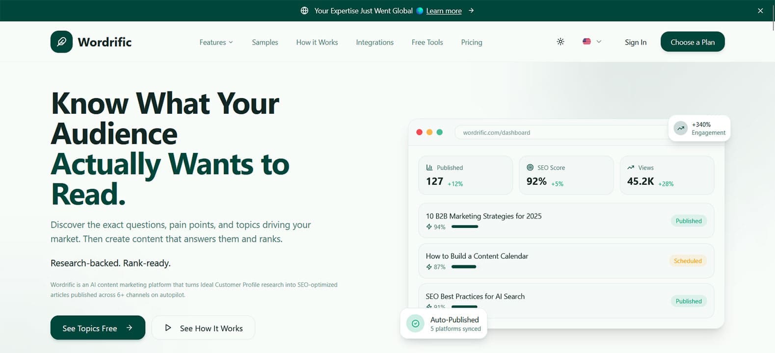 Därifrån utarbetas nyckelord och ämnen, som sedan kan struktureras till artiklar och innehåll. Detta är designat för att tilltala både SEO och generativ motoroptimering (GEO), och ämnen kommer att finnas hemma på Google och ChatGPT.