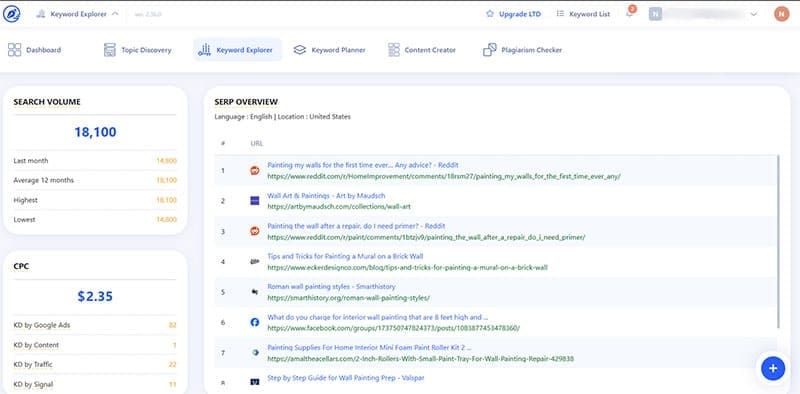Här är ett exempel på en instrumentpanel för sökordsforskning om termen ”väggmålning” (som i, måla väggar).